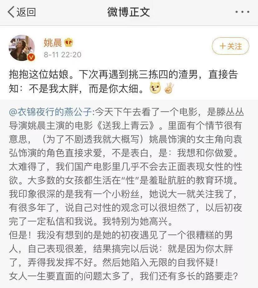 姚晨转发说,下次再遇到挑三拣四的渣男,你就这么回答:不是我太胖,而是你太细。