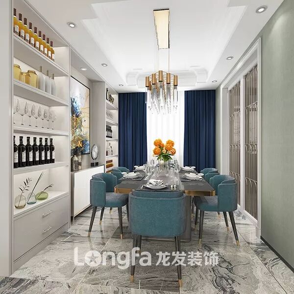 餐厅:金属边框的运用搭配现代材质,充满都市情调,墙面酒柜设计增大了收纳空间。