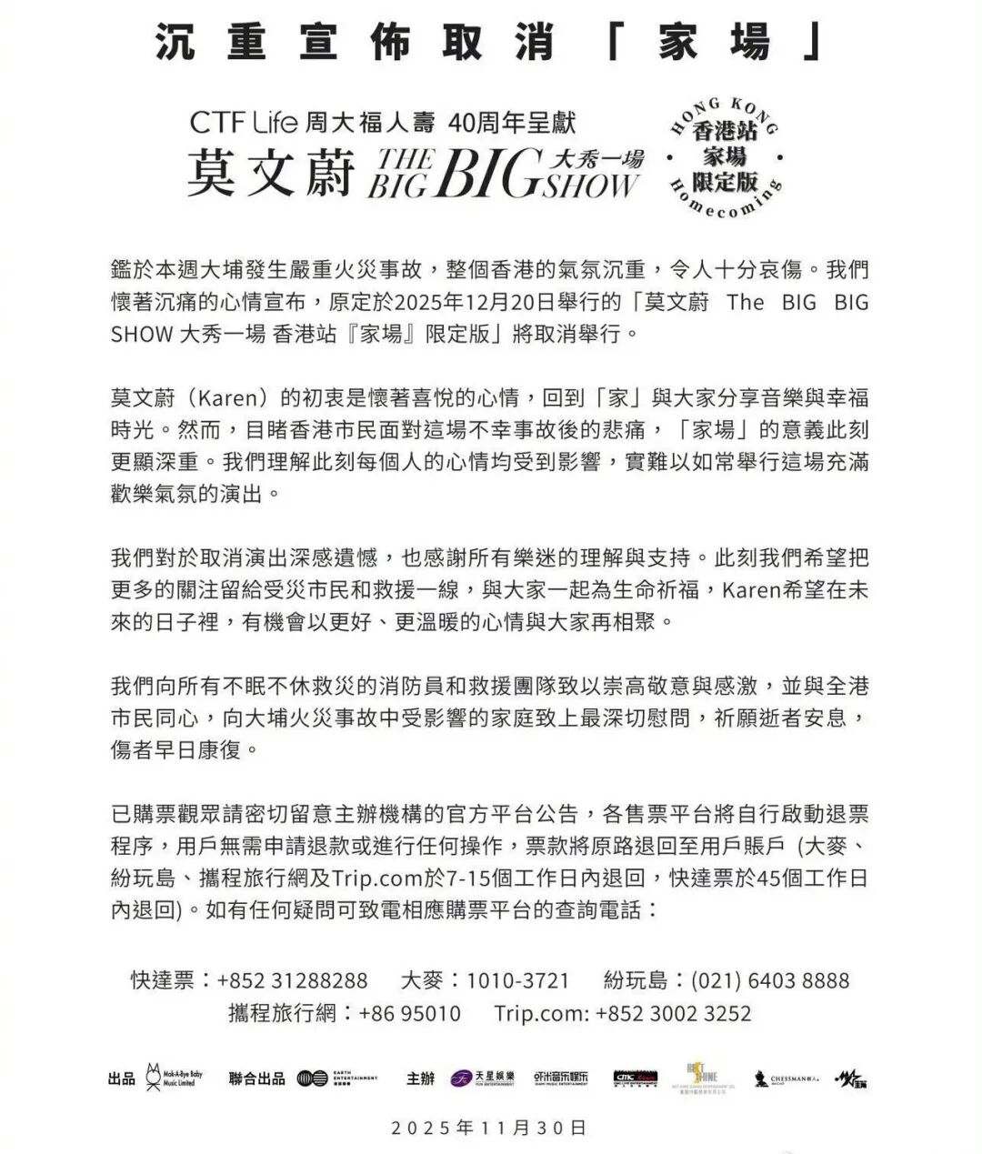 莫文蔚团队表示,在这场灾难面前,欢乐的演出与悲伤的社会氛围显然格格不入。原定的香港站演唱会,原本是以“家场”为主题,希望通过与家乡的观众共同分享音乐和幸福时光,传递一份温暖与欢乐。然而,突发的悲剧让这一切都变得无比沉重。在这场灾难面前,莫文蔚清楚的明白,演出和庆祝的时刻应该留给那些在灾难面前站在前线的消防员和救援人员,同时也要为受灾的市民们送上最诚挚的关怀与祈福。