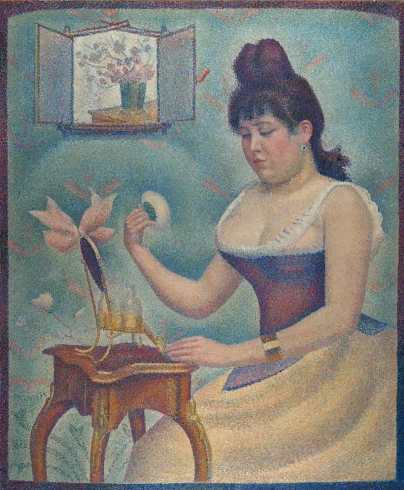 图9 修拉,《扑粉的女子》,1890年。自我关注被画家幽默地提升到艺术境界。模特不仅是修拉的情人,还怀着他的孩子(应该是出于美观方面的考虑,他才没描绘她的孕身)。这是第一件展现出修拉古怪幽默感的大作。他是否也在暗示,女人往脸上扑粉,其实和他在画布上添加色点没多大区别?两者说白了都是为了粉饰缺陷。