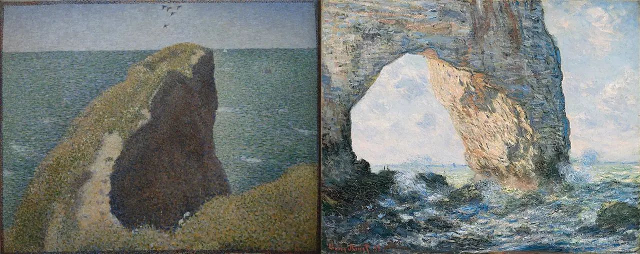 图6 左:修拉,《葛兰德坎普海景》,1885年;右:莫奈,《大岩门》,1883年。两幅画描绘的都是诺曼底海岸线上著名的岩景。修拉迎面挑战了前辈莫奈。晚辈用冷静有序的色点对付大师活力充沛的笔触。一幅画中风平浪静,另一幅波涛汹涌,两件作品宛如对联。