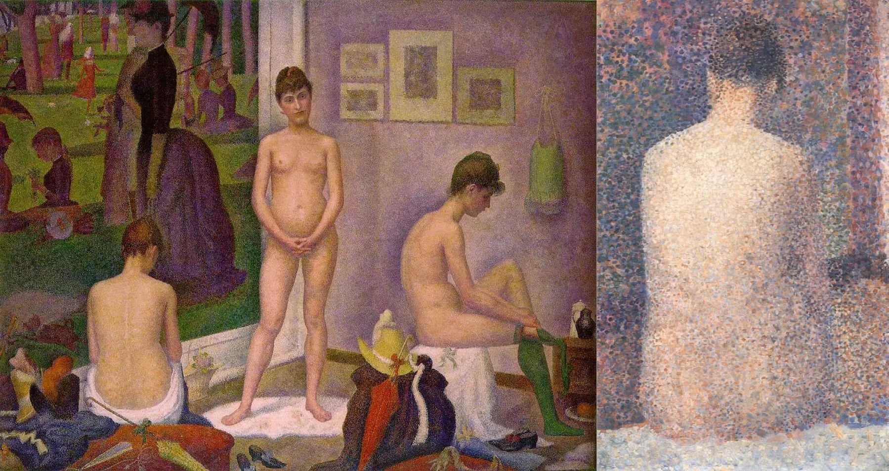 图8 修拉,《模特》(左),1888年;《模特的背影》(右),1886年。《模特》是修拉第一件从头到尾都以点彩画法完成的大尺寸作品。《模特的背影》则是画家做的功课之一,虽然旨在练习,却完美无缺,堪称一绝。修拉画《模特》主要是想证明点彩也适用于裸体。为此,画家从不同角度描绘了三个裸女。生怕还有人不明白他的企图,他又复制了《大碗岛》的局部,用画中衣冠楚楚的人物当反衬。