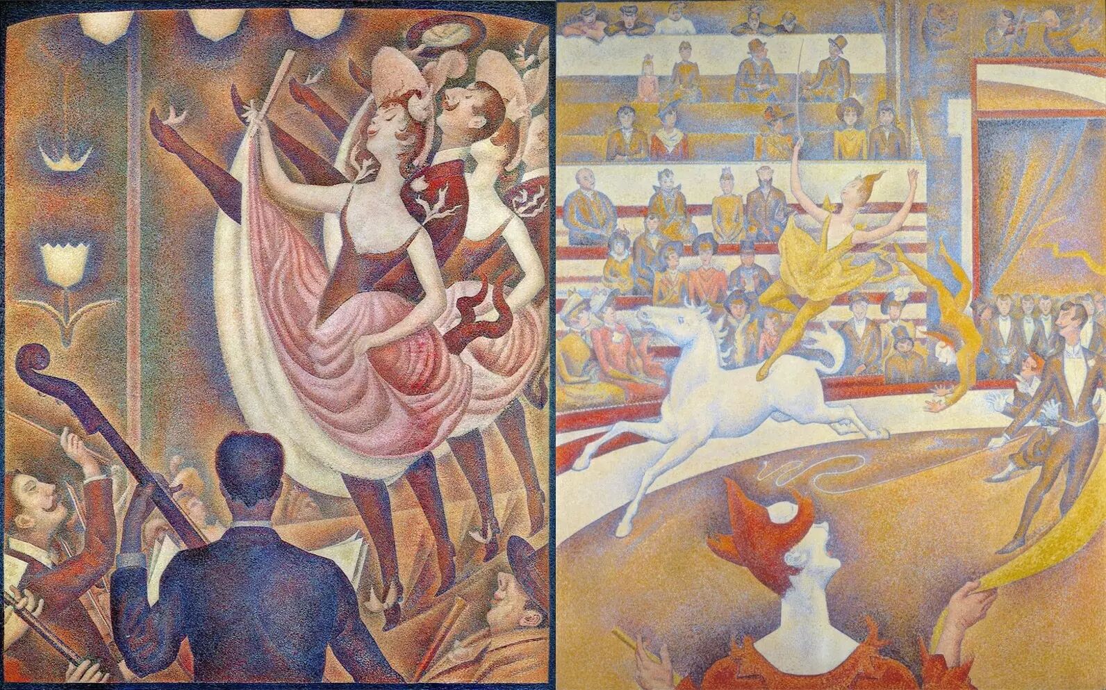 图10 修拉,《嬉戏》(左),1890年;《马戏团》(右),1891年。《马戏团》是修拉最后一件大尺寸作品,在他死前仍未完成。《嬉戏》像一首打油诗一样,押了不少滑稽的“韵”。比方说,画中两人胡子的样式和另外两人嘴唇的形状一致。这种诙谐不可能出现在修拉早几年的作品中。两幅画也都用到了商业设计手法,应该是受到了海报大师谢雷特(Jules Chéret)的影响。和当时为数不少的文艺圈人士一样,修拉极其欣赏谢雷特有点俏皮又自成一派的广告。
