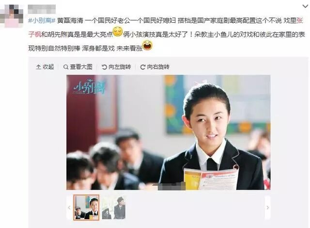 可能这样邻家女孩的状态更有观众缘,在《小别离》播出后,也确实有很多网友表示,很喜欢张子枫的演出。