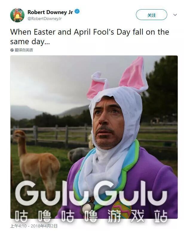 如果说吴京这个造型还比较正经的话,我们再来看看愚人节版的“托尼斯塔克”大爷。小罗伯特唐尼又晒出了自己前几年的复活节兔子装扮……可以说是非常可爱了。