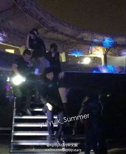 目击者称,Krystal表演最后一首歌《Red Light》的时候带着墨镜,表演完后立刻晕倒在台阶上,被工作人员扛在肩上,之后被一辆车接走。据悉,Krystal最后演唱会谢幕时没有出现。