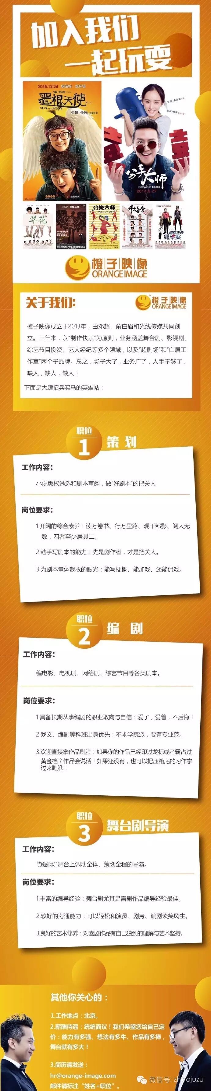 邓超、陈坤公司招聘英才 找剧组 内地男星 2016-06-11 01:15:57 360 创作不易,用心坚持,欢迎请BaGua喝几杯爱心咖啡!打赏并支持本文 打赏并删除本文 1.邓超的公司橙子影业招兵买马策划、编剧、舞台剧导演地点:北京简历请发送:[email protected]2.【北京:陈坤工作室大招募】新媒体宣传、影视项目统筹等简历投递:[email protected] 创作不易,用心坚持,欢迎请BaGua喝几杯爱心咖啡!打赏并支持本文 打赏并删除本文 感谢您的支持鼓励,我会继续努力的!文章地址:用户邮箱:打赏金额:USDT 请输入数字点击”去打赏“,即可进行打赏支持本文章哦 陈坤 About the Author 找剧组 功能介绍:中国唯一剧组招聘平台,致力于为剧组提供幕前幕后各类专业人才招聘服务。 Related Posts 邓超、陈坤公司招聘英才 2016-06-11 01:15:57 发表评论