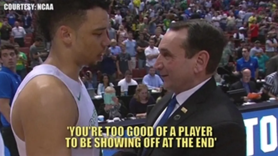 (有意思的是,狄龙当场道歉并在赛后将此事告诉记者,结果K教练反不承认他说了这番话,到后来有人把两人在场上对话的视频发到网上,K教练郑重其事地发了份声明,向俄勒冈大学和狄龙道歉。只能说大学篮球氛围确实不太一样。)