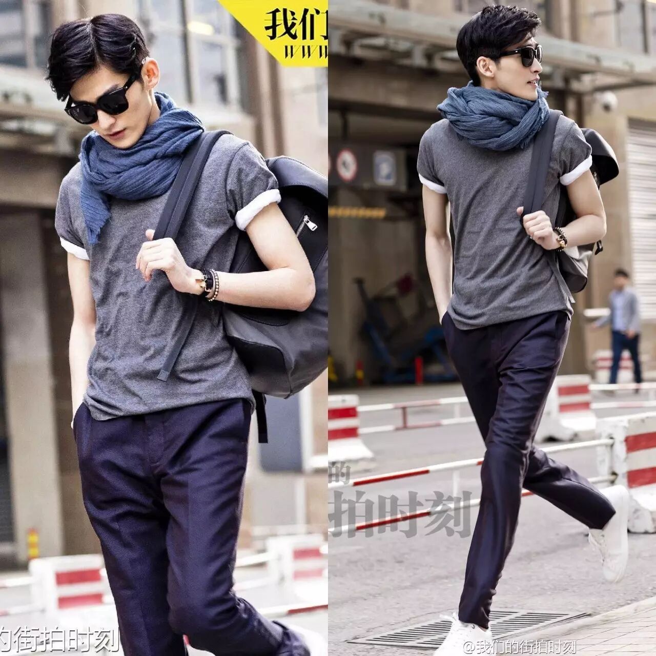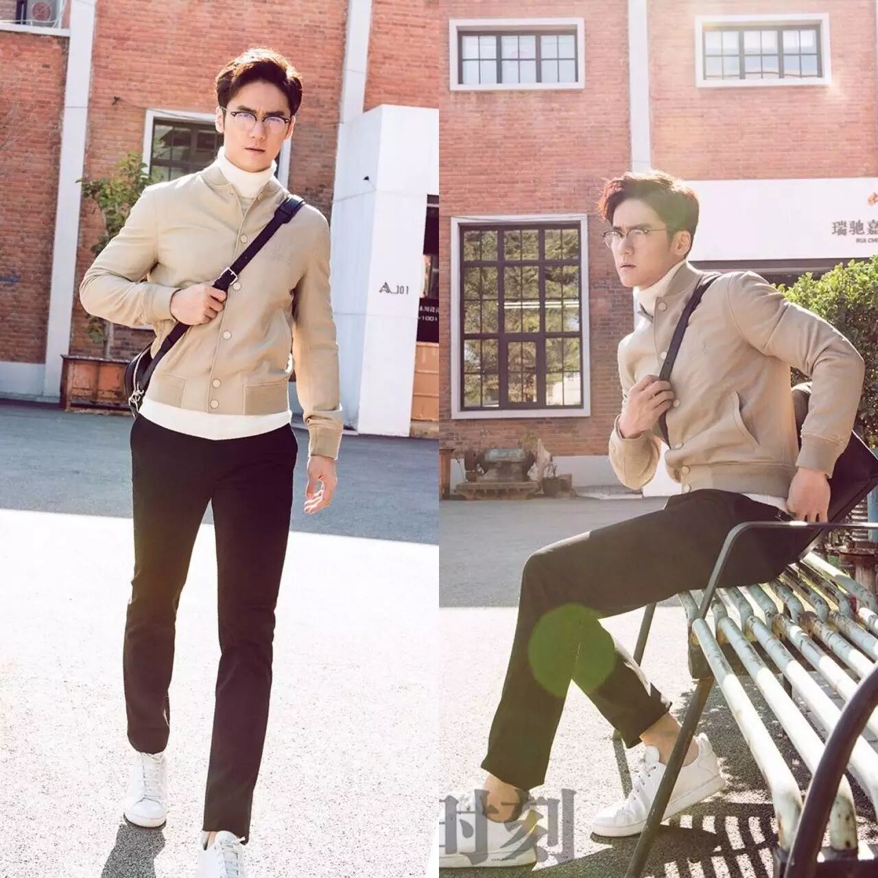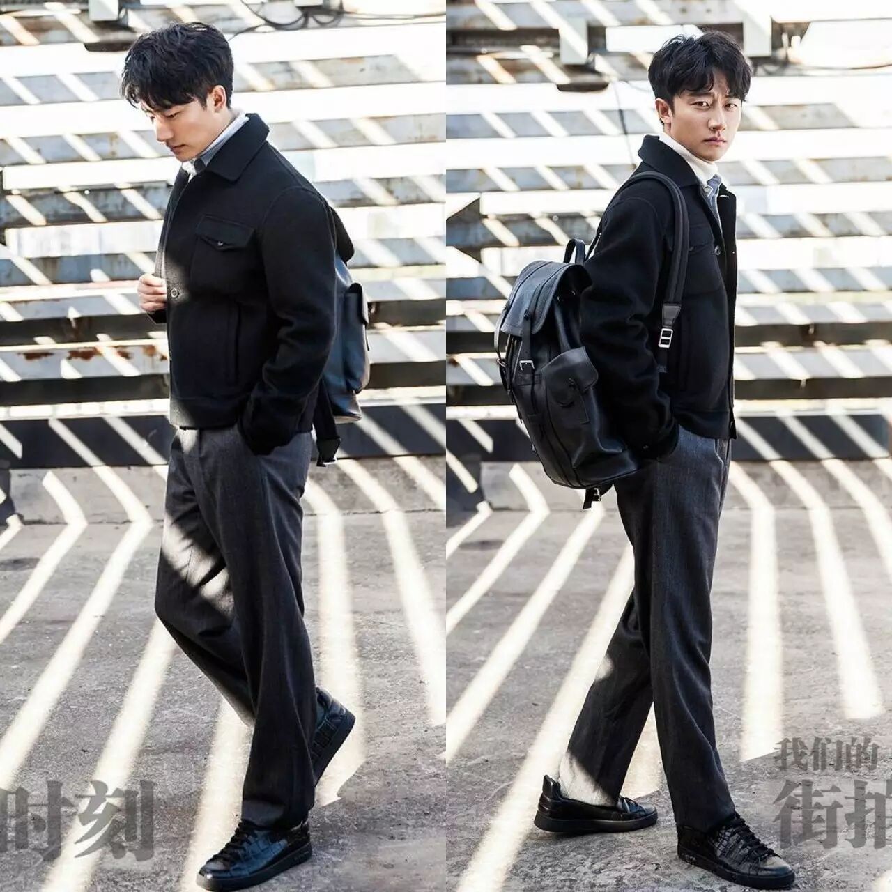 浅灰色衬衫、白色高领衫、灰色西裤、黑色休闲鞋、双肩包均为:LouisVuitton