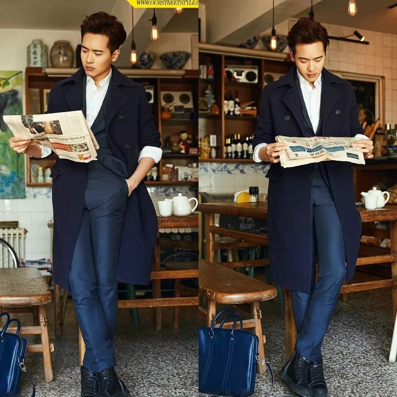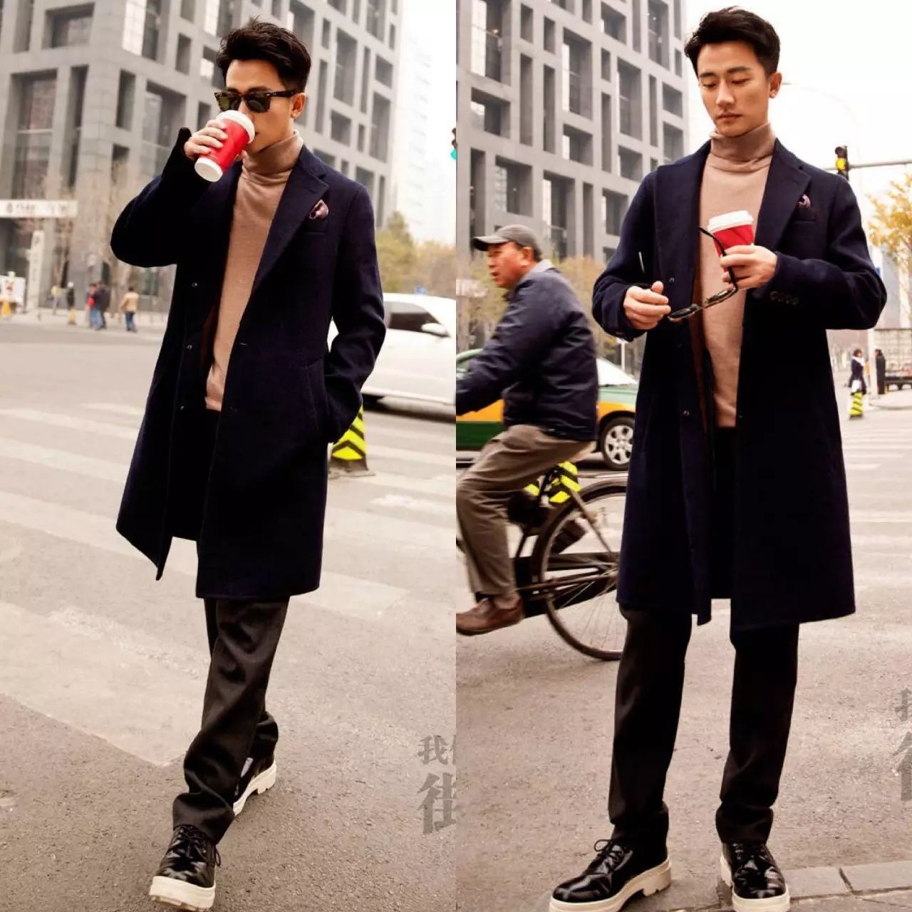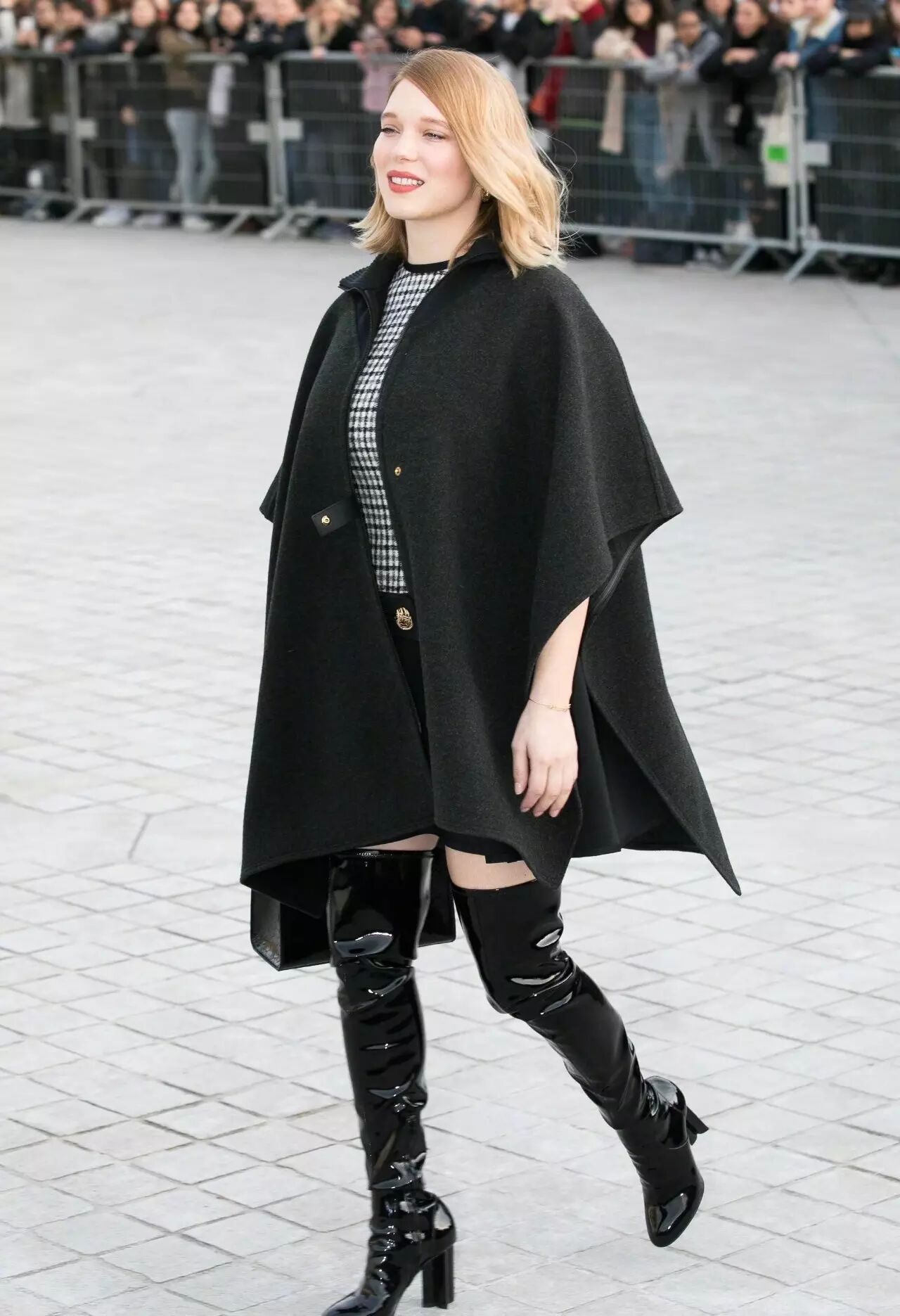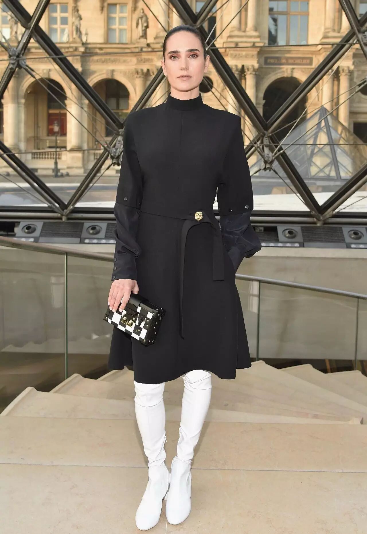 深蓝色外套、内搭白色上衣、黑色裸靴均为:Louis Vuitton