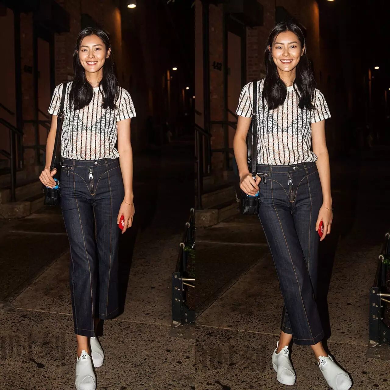 白色镂空上衣与黑色单肩包:私人物品,牛仔裤:Louis Vuitton