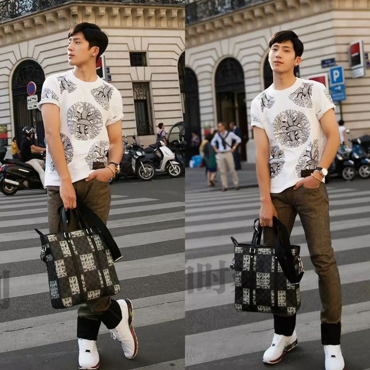 白色印花T恤、棕灰色长裤 、黑白格子印花手袋均为:Louis Vuitton