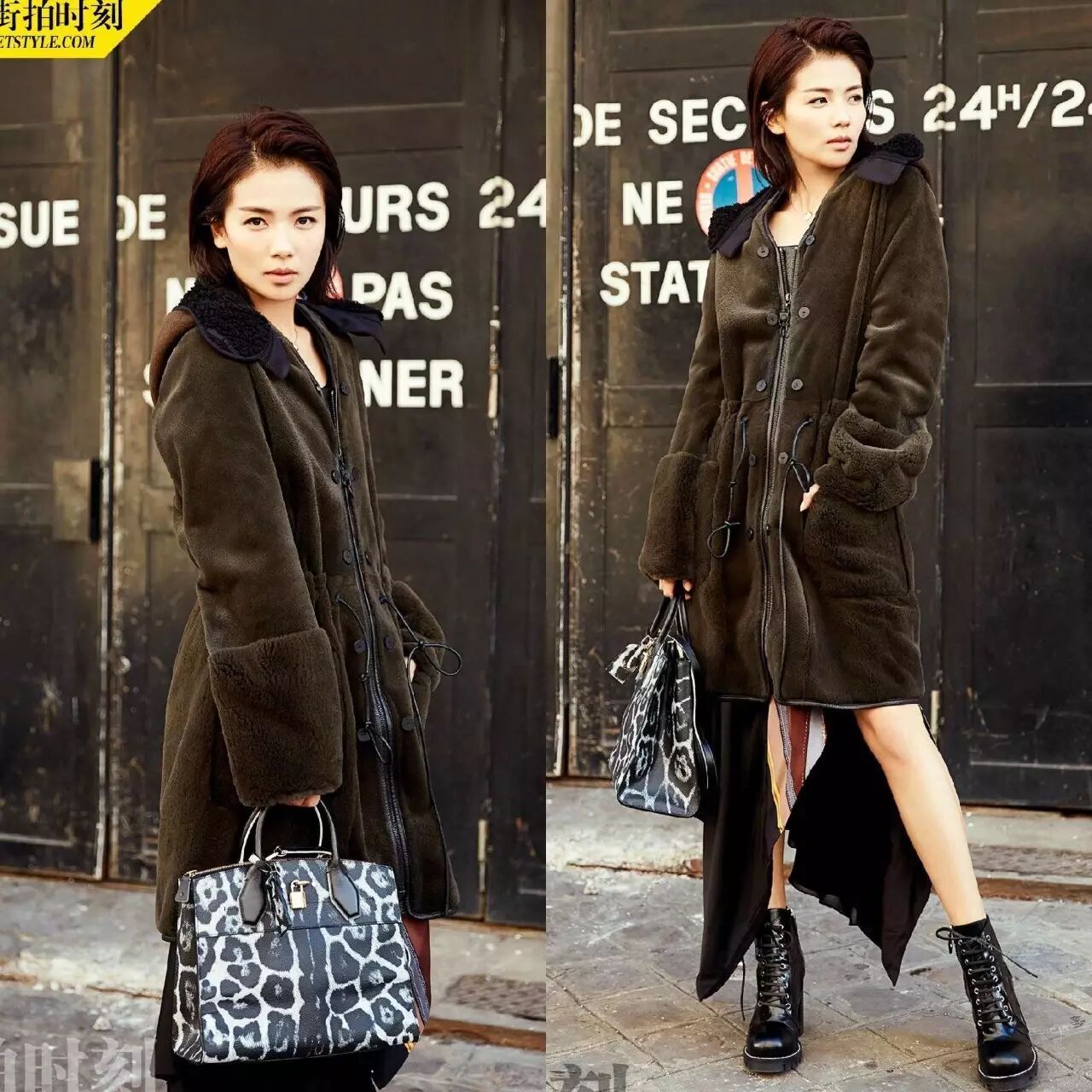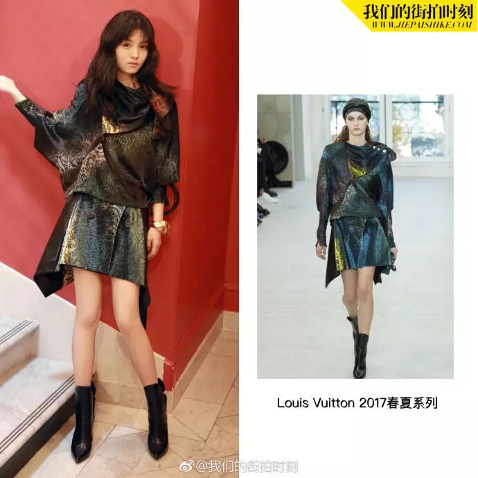 春夏身着 Louis Vuitton 2017春夏系列蛇纹印花绸缎上衣、蛇纹印花不规则短裙搭配及踝靴和Parure Coquillages手镯亮相。会演戏的演员,拍照都极具质感,电影画面的代入感超赞,期待你的新作品。