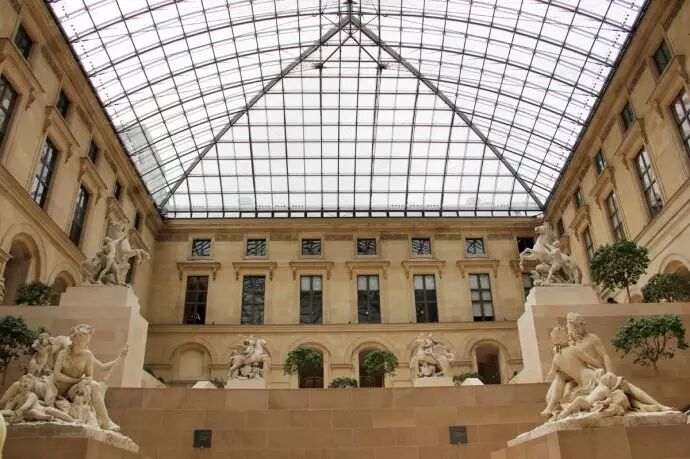 这次 Louis Vuitton 把秀搬到象征法国文化的符号卢浮宫的中心区域,气势最恢宏的“马利中庭”。