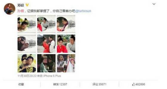 在《芈月传》开播时,孙俪和黄轩、方中信、高云翔分别有三段不同的感情对手戏,于是邓超就找了一系列这三组CP的“亲密”剧照,在微博上声称掌握了孙俪的“出轨证据”!