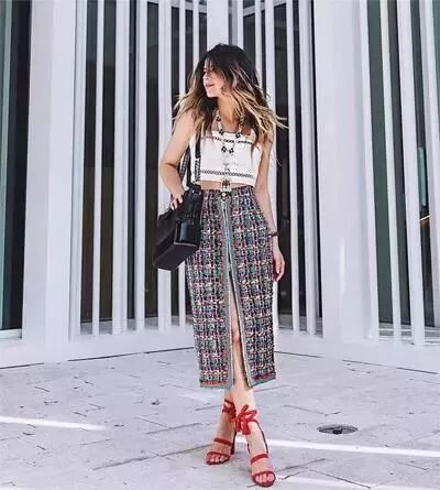 搭配彩色的开衩半裙呈现若隐若现的小性感,