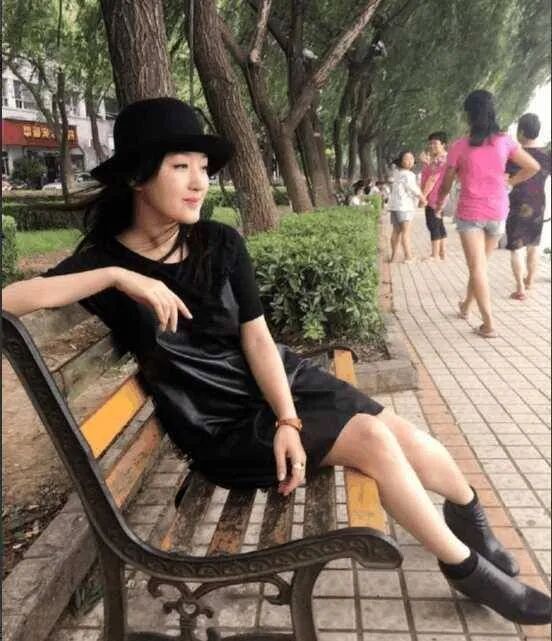 这个时候是出去外面玩,头上戴着一顶黑色的帽子,而且她身上穿着的这条裙子,选择的颜色也是黑色的,可以看到这条裙子的长度还是比较短的那一种,显得下面的小腿看起来还是比较的漂亮,穿着一双黑色的高跟鞋。