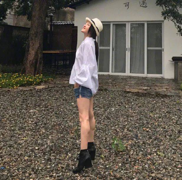 上面是穿着一件白色的衬衫,这件衬衫穿在身上的话看起来会比较的宽松,下面搭配了一条牛仔裤,深蓝牛仔裤的长度确实是比较短的那一种,可以看到平时会锻炼自己的身体,所以小腿那里的肌肉特别的发达。