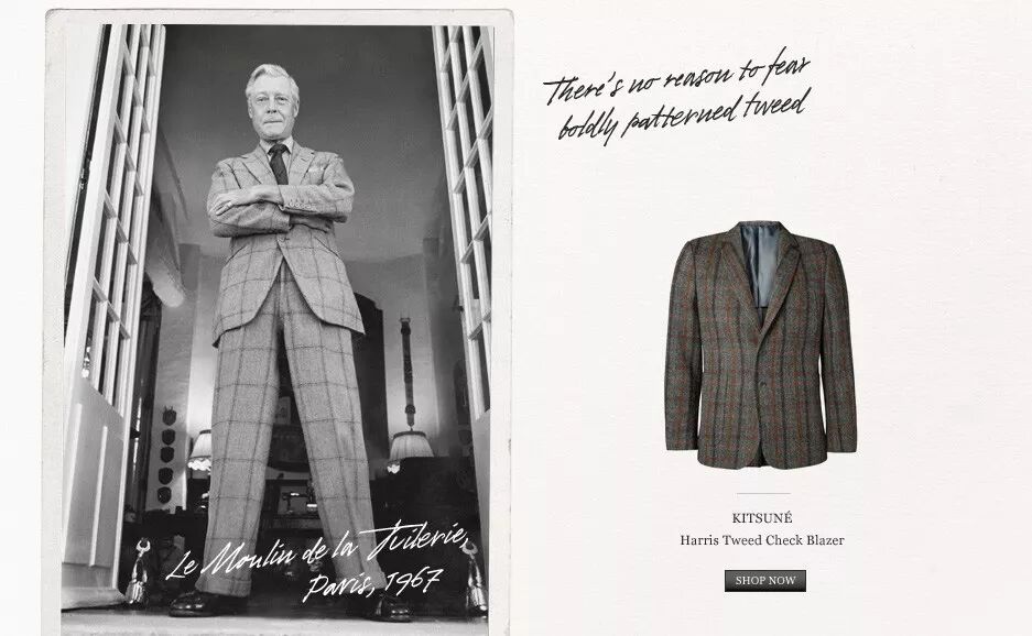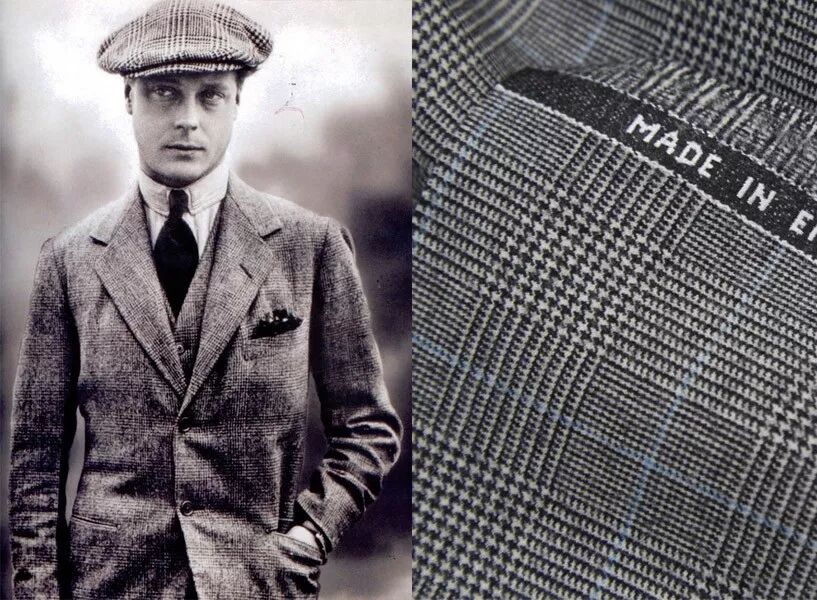 19世纪伯爵夫人Earl of Seafield第一次把Glen Plaid制成外套的时候,是给庄园里的管家穿的。但后面这款面料被威尔士亲王(温莎公爵)发现并获得了他的青睐,亲王常常穿着这种花纹制成的衣服去打猎什么的。