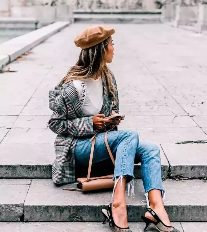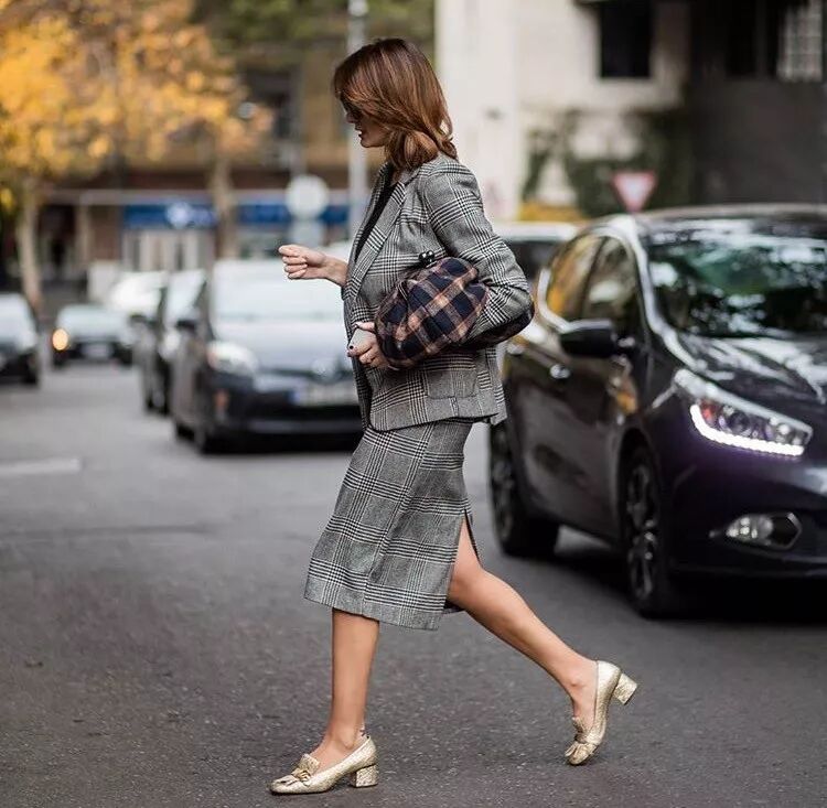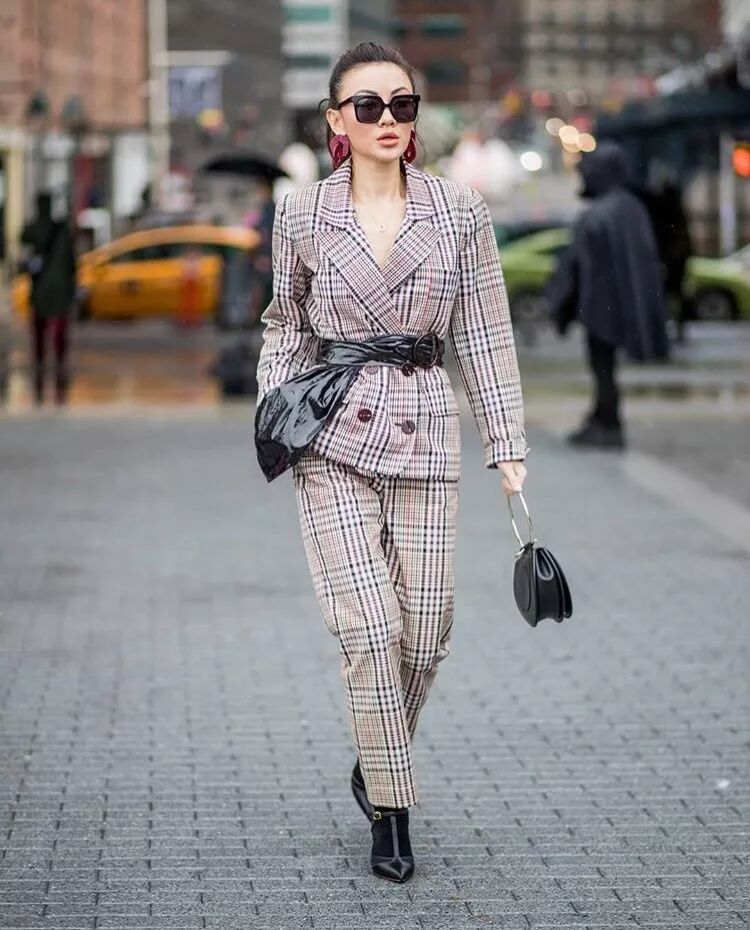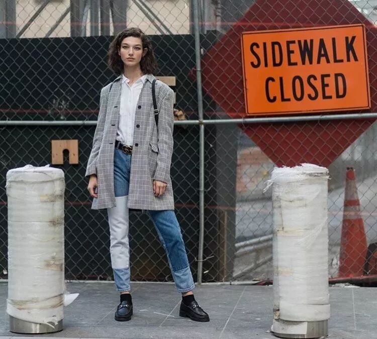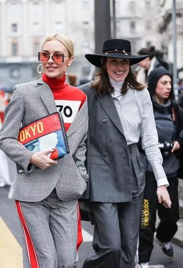 穿套装系列的也有,这样的穿法比起搭牛仔裤看起来风格更强烈。整体的格纹会带来比较抢眼的视觉效果,穿搭难度会比配牛仔裤难一些。