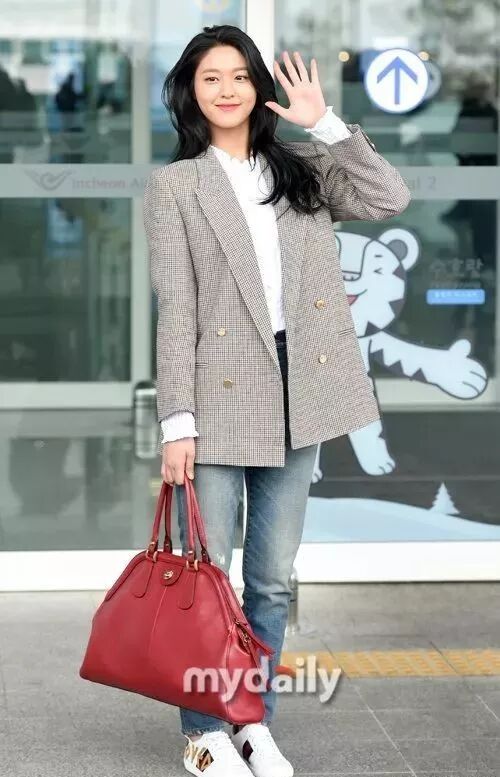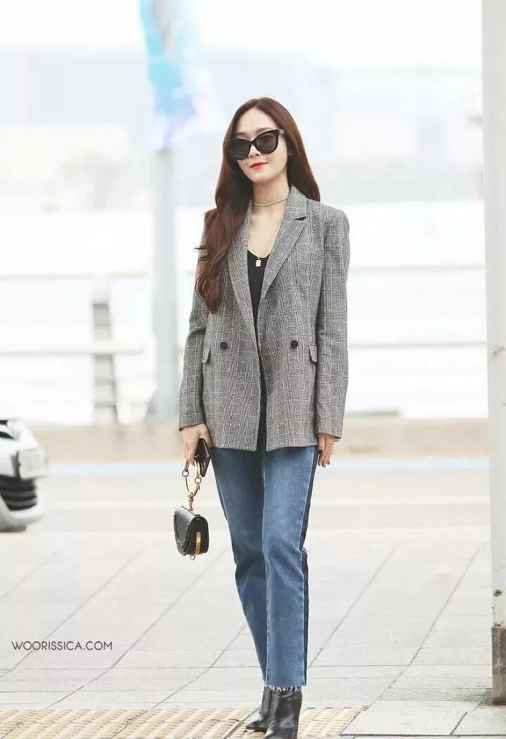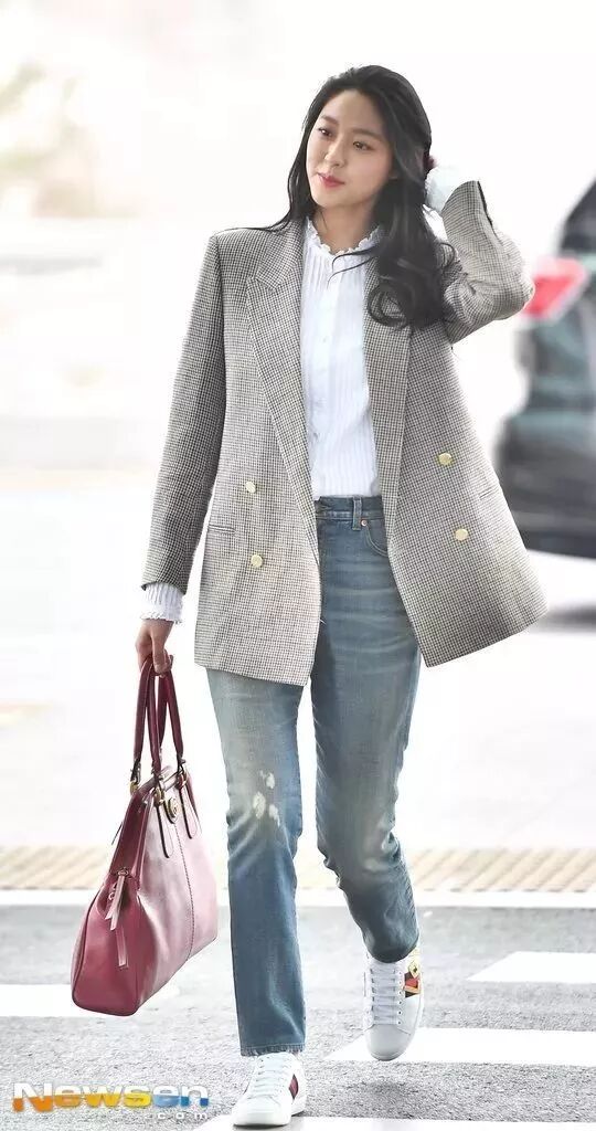 韩国爱豆金雪炫的机场私服也是类似款的格纹西装外套,搭配一件可爱的衬衫和牛仔裤,非常日常的搭配,舒服又简约。