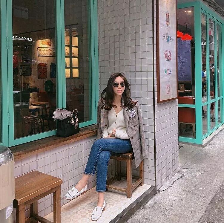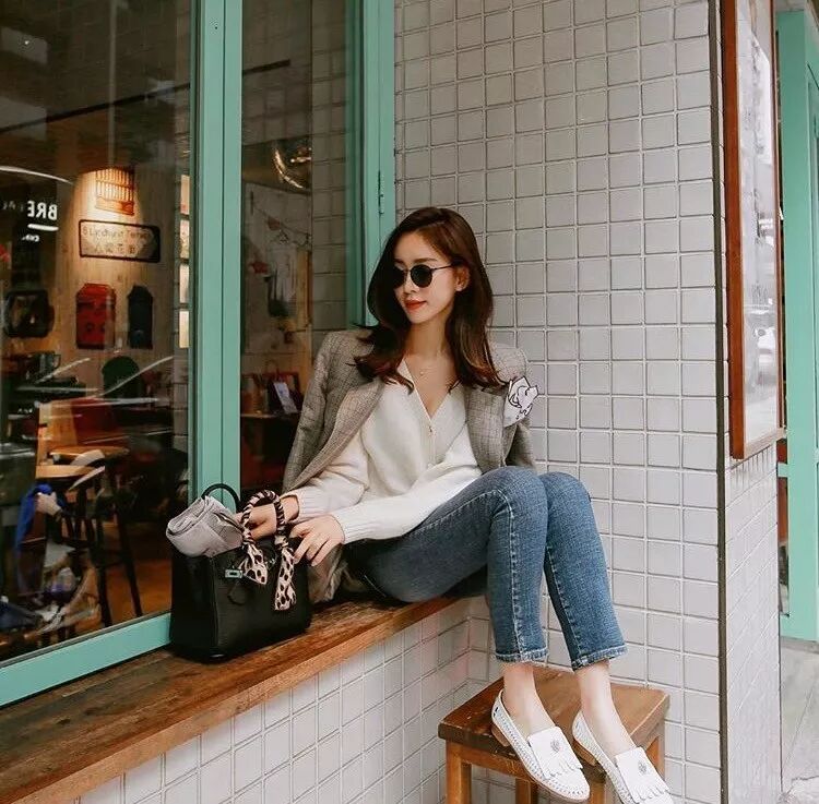 韩国的博主们也是喜欢搭配长裤的穿法。基本上都是内搭白色款,下身是牛仔裤。
