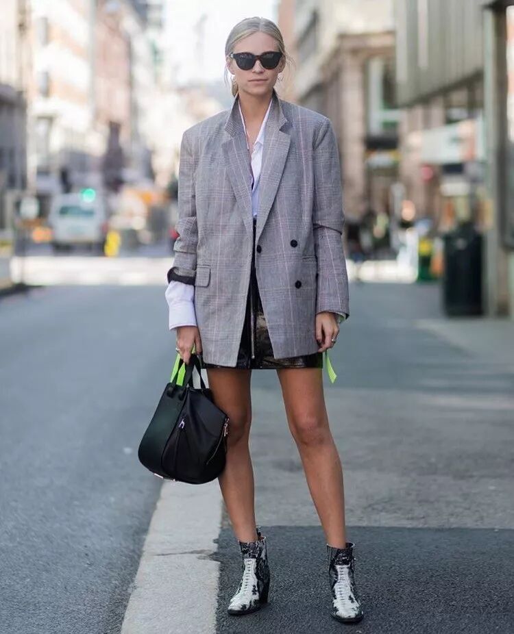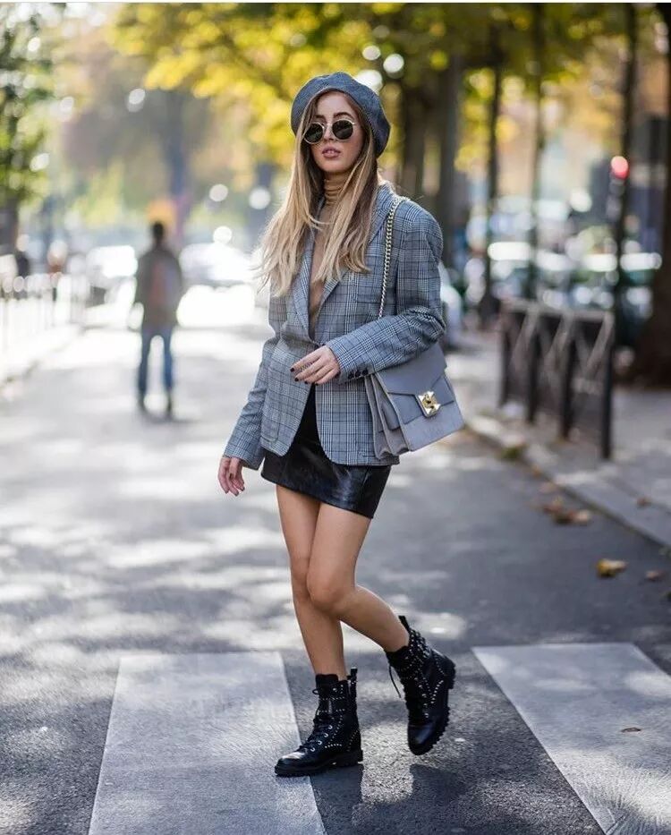 还有另外一种穿法是局fa比较喜欢的,就是搭配半裙。欧美的时尚达人们都比较喜欢搭配皮质半裙,然后脚踩一双靴子,时髦又帅气。