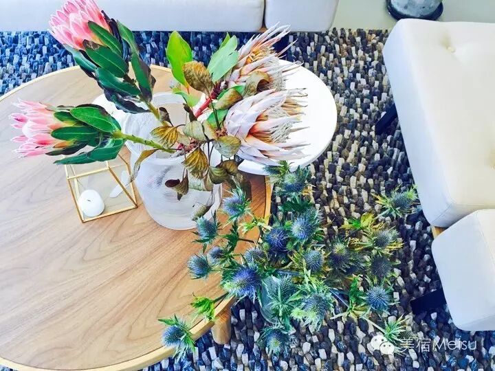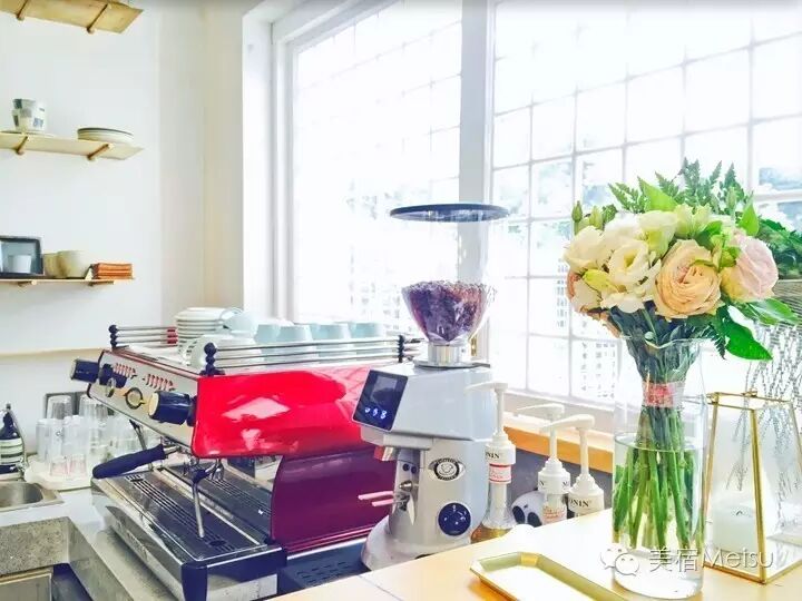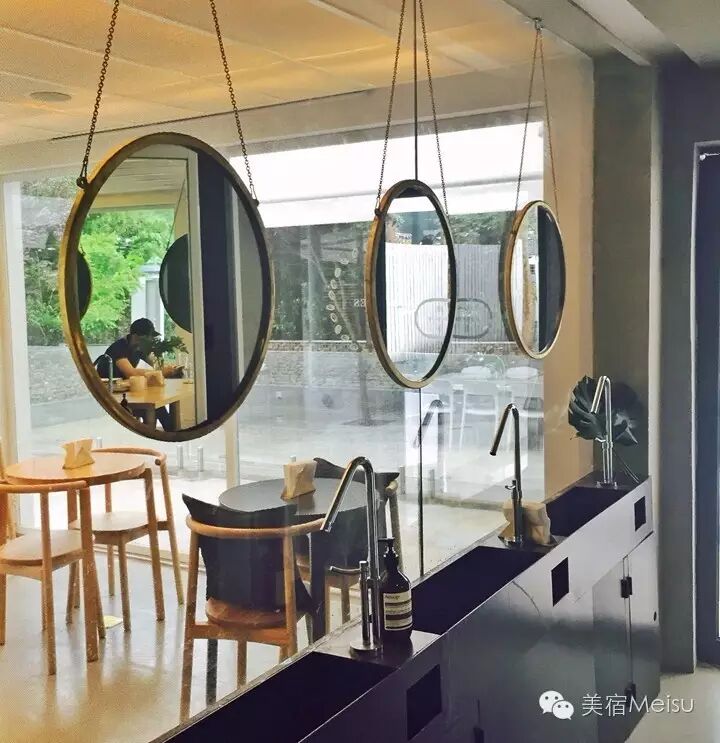 等到步入其中,不禁感叹,果然真正的民宿都是带着主人的气息的。放眼望去,一楼的室内公共空间虽不是很大,但通过这种明亮简约的设计丝毫不让人觉得狭小,反倒是很洋气很温馨,而且,户外庭院是超宽敞的,布置精巧,就是为了让你完全不觉得地儿不够!MUJI家具、从日本带回来的灯饰、色彩突跳的鲜花……各种精致物件拼接而成的画面,在每一次定格时,都好像是文子和浩森的某个摄影作品。功能区分也很明显,卫生间的铜镜都是纯手工打造的,AESOP的洗手液必是很讨细节控的芳心;咖啡吧是我后文要重点介绍的!