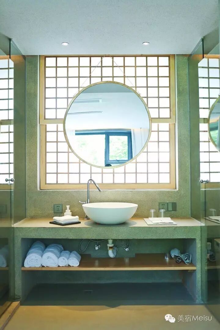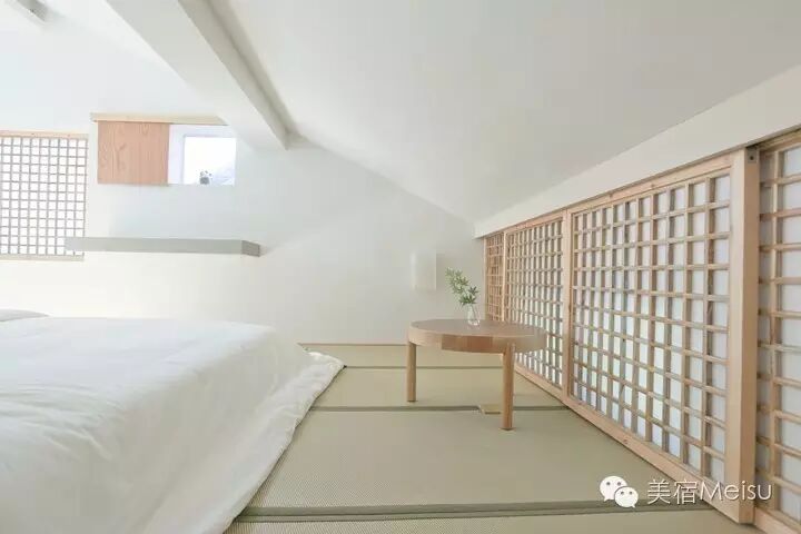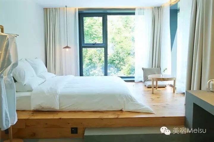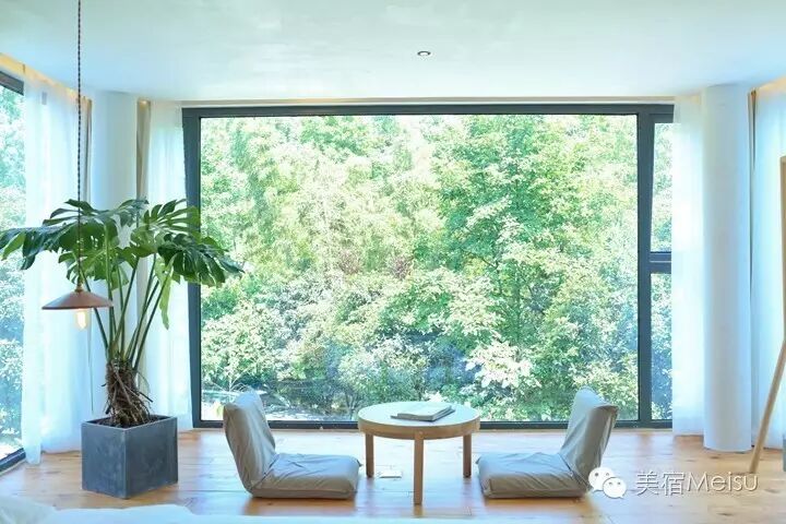 客房主要分布在二三楼,再加上后院空间独立的1号房,共有6间。参观的时候,就感受到了融合其中的几分日系味道,一样的MUJI家具、日本买来的灯饰、榻榻米、极具光影美的格子窗……没错,这也是文子和浩森所偏爱的,高品质的日系风在江浙民宿中实为难得。每一间客房都有极好的采光,在这玲珑精致的卧室里,欣赏着窗外那浓浓的绿意,我想再失落的心情也会被慰藉吧。