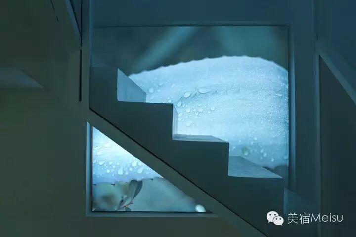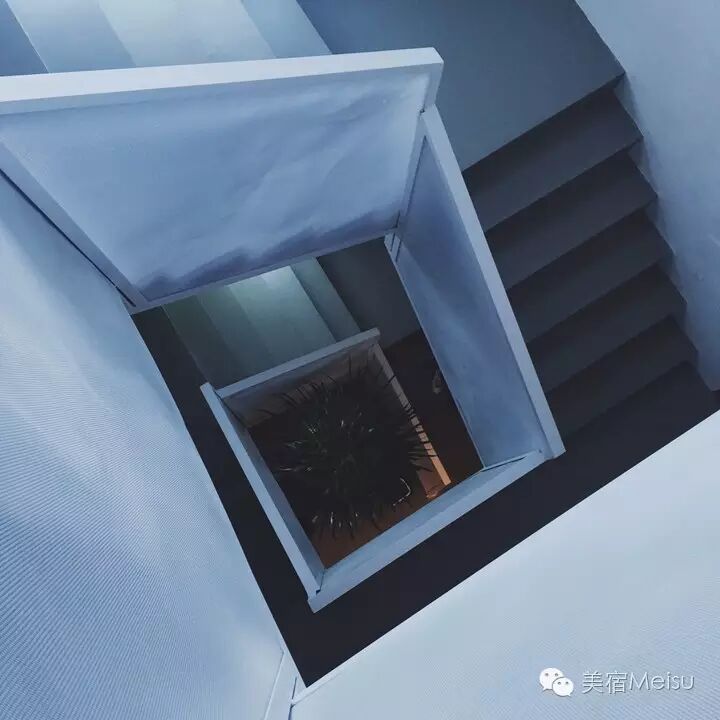 别止的楼梯也是不得不说的一大亮点,用纯白网状菱形侧板取代传统扶手,颇有现代艺术感,为了与此般配,楼梯处三个变幻的遮光卷帘也花了不少心思选购。夜晚,顶层三楼的直射灯垂直照下,便会形成一束美美的光影。