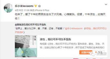 近日,电视剧《凉生,我们可不可以不忧伤》正式启动,这个故事存在于无数人的青春,这次是真的来了。15日,小说作者乐小米转发凉生官微微博称“他来了,爱了十年的男朋友走出了次元墙,心情复杂。但望,十年凉生,此情天佑!”