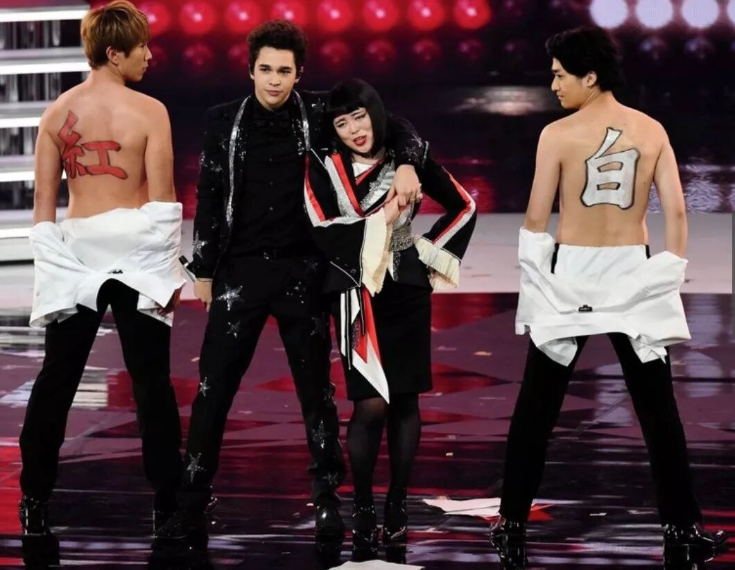 此次红白ブルゾンちえみwith B 和《Dirty Work》原唱者·Austin Mahone带来了最新的段子合作。ブルゾン在新段子中饰演了“从美国来的新闻职场女性”的角色,是专程来报道红白的设定。但是在介绍「日本で一番視聴率を取る番組…」时,不小心吃了螺丝。