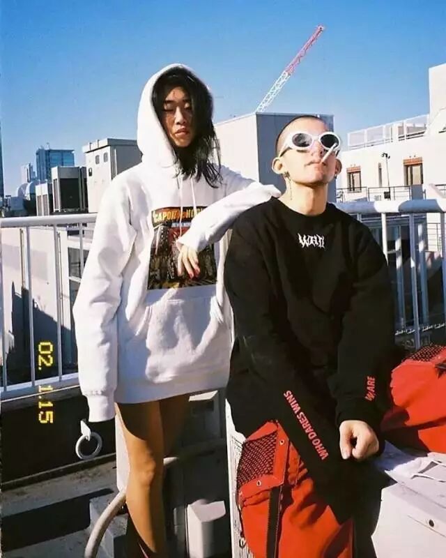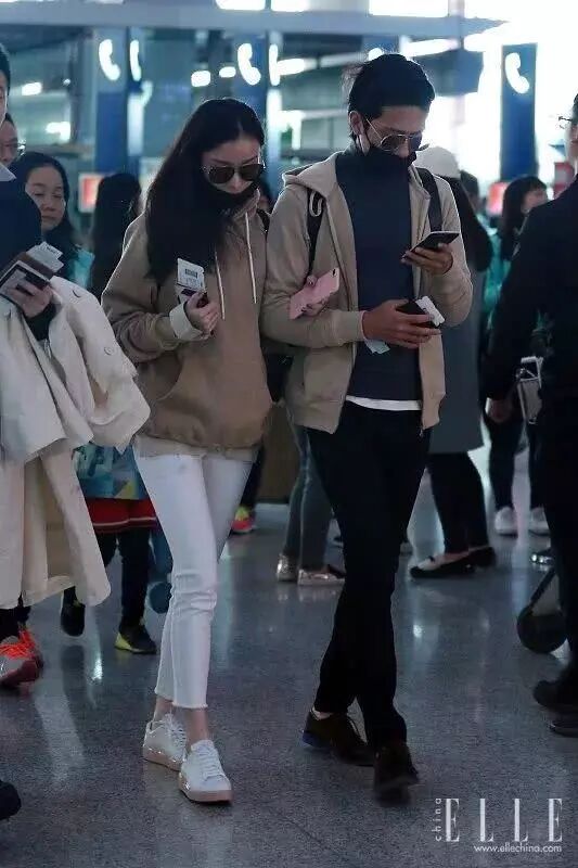 倪妮是套头卫衣,小井的是拉链外套款;太阳镜、口罩是同款,裤子、鞋子则以黑白两色做出明确区分。整体统一,又有明显区别也很棒啊!