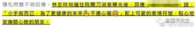 患癌消息出来后,林志玲经纪人曾出面辟谣,表示林志玲住院手术是支气管炎手术,并非是传言所说癌症,而林志玲近日也回复了媒体的关心,否认患癌,表示“小手术而已,为了更健康的未来,不担心喔”