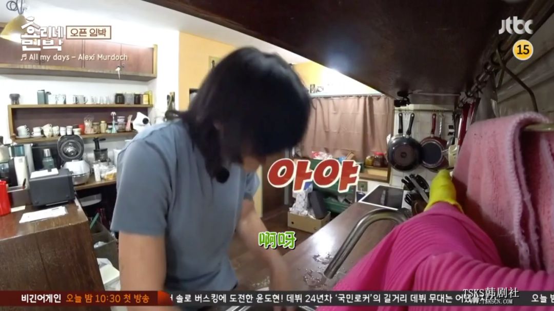 ▲ 吊柜安装的太低了,李尚顺在自己家厨房都撞头了,吊柜下方是安装了灯的,这一点做得还不错