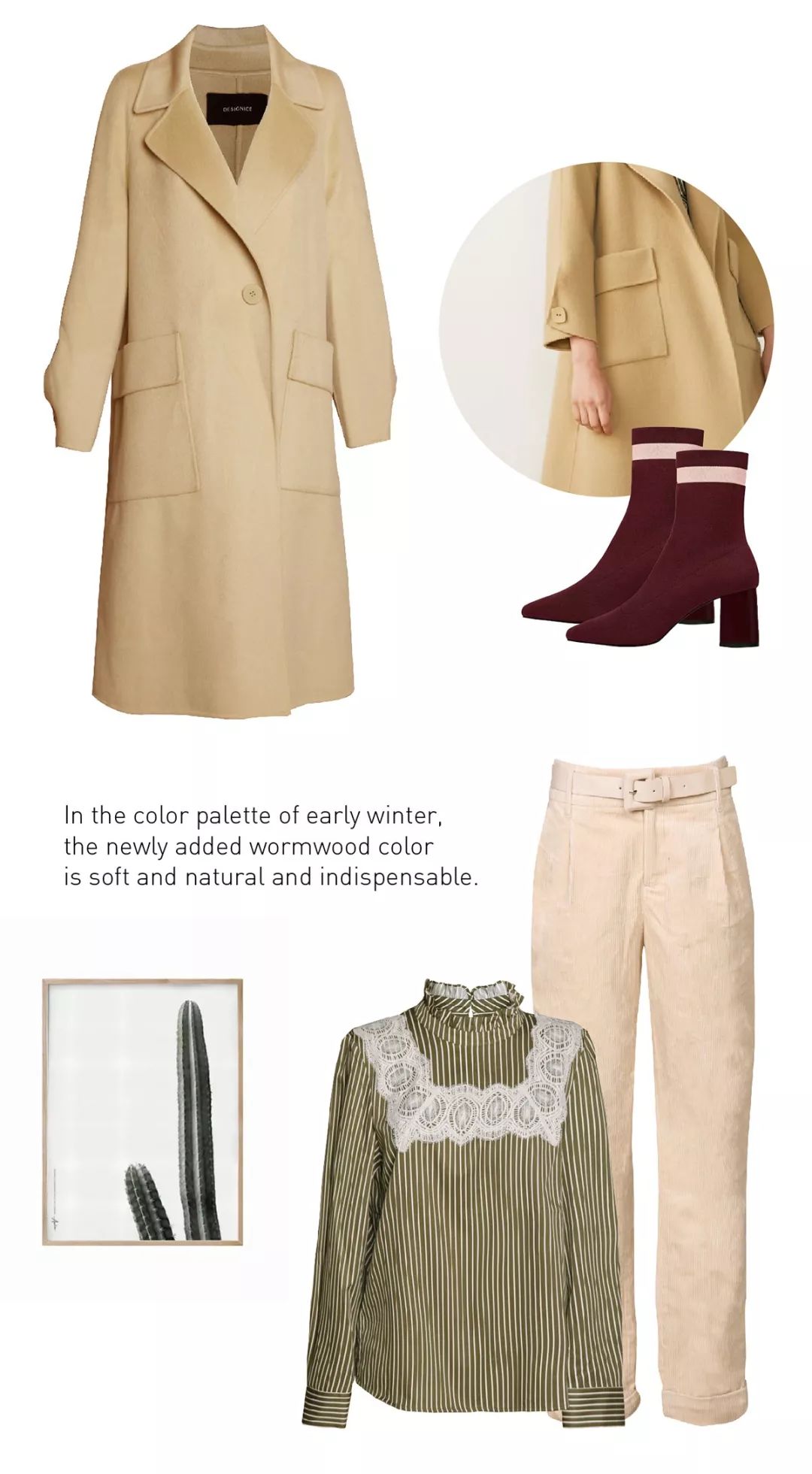 初冬的调色盘里,新添的艾草色色彩柔和天然,不可或缺,配以橄榄绿上衣,结合设计,更具女性的优雅,书写冬日里的温婉格调。