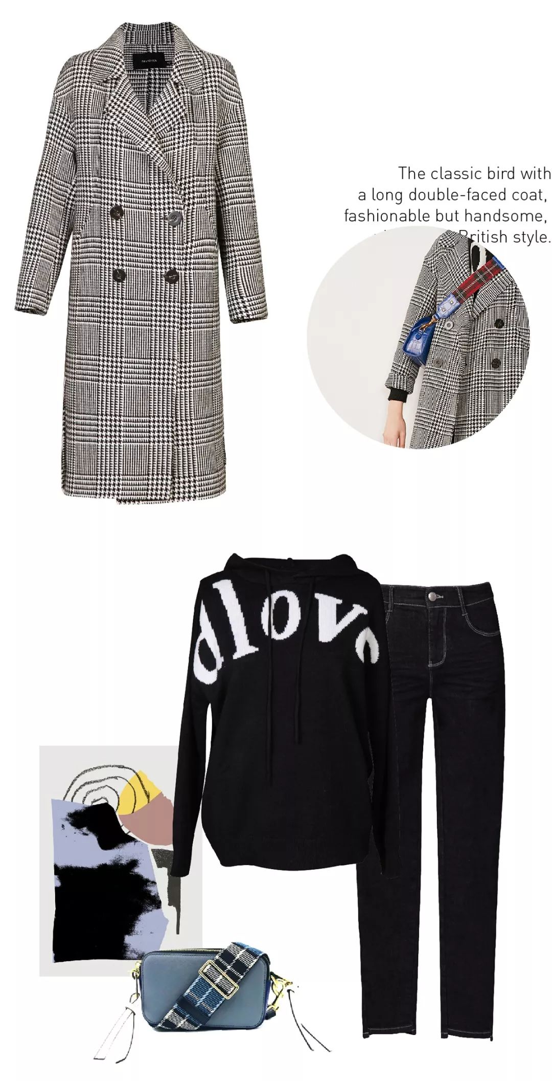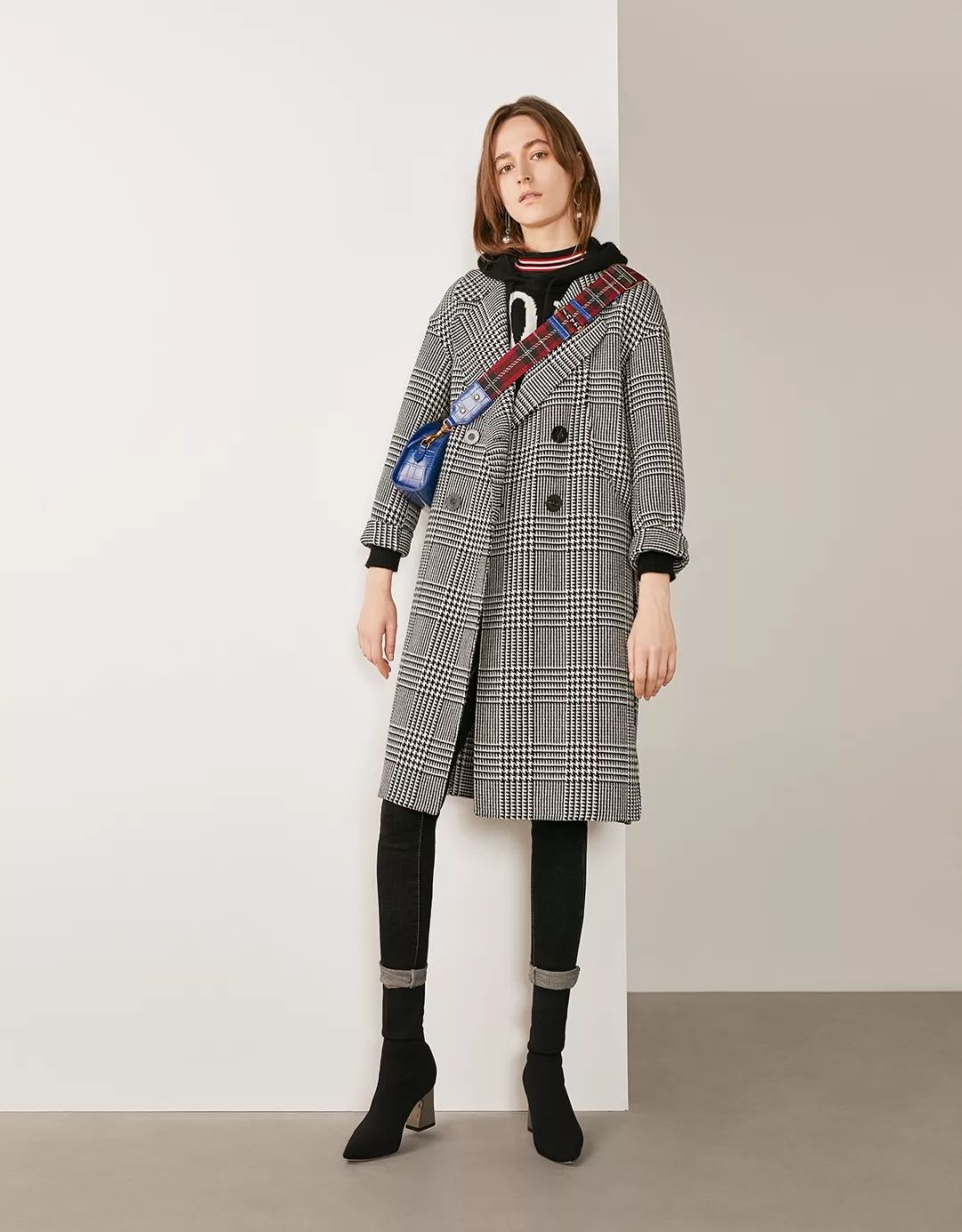 经典的千鸟格长款双面呢大衣,前身巧妙的弧形分割线搭配特定的树脂双排扣设计,时尚而又不失帅气,洋溢着浓浓的英伦风情。