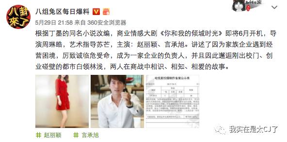 而此时,有爆料说6月份赵丽颖还有一部戏要开机,是丁墨小说改编的《你和我的倾城时光》,男主言承旭。