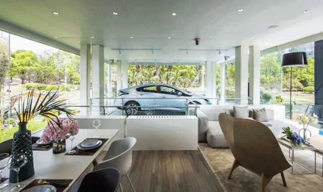 别克汽车也曾为配合新车型上市,在黄浦江边造了一座主打智能和环保设计的概念屋---美好屋托邦,采用轻量化、可回收的环保绿色建材,通过太阳能光伏板供电、房屋雨水收集系统循环生活用水,打造出一个未来感的生活体验环境。
