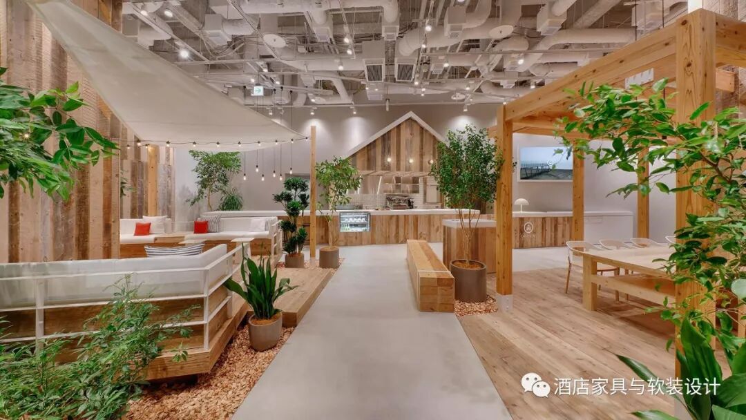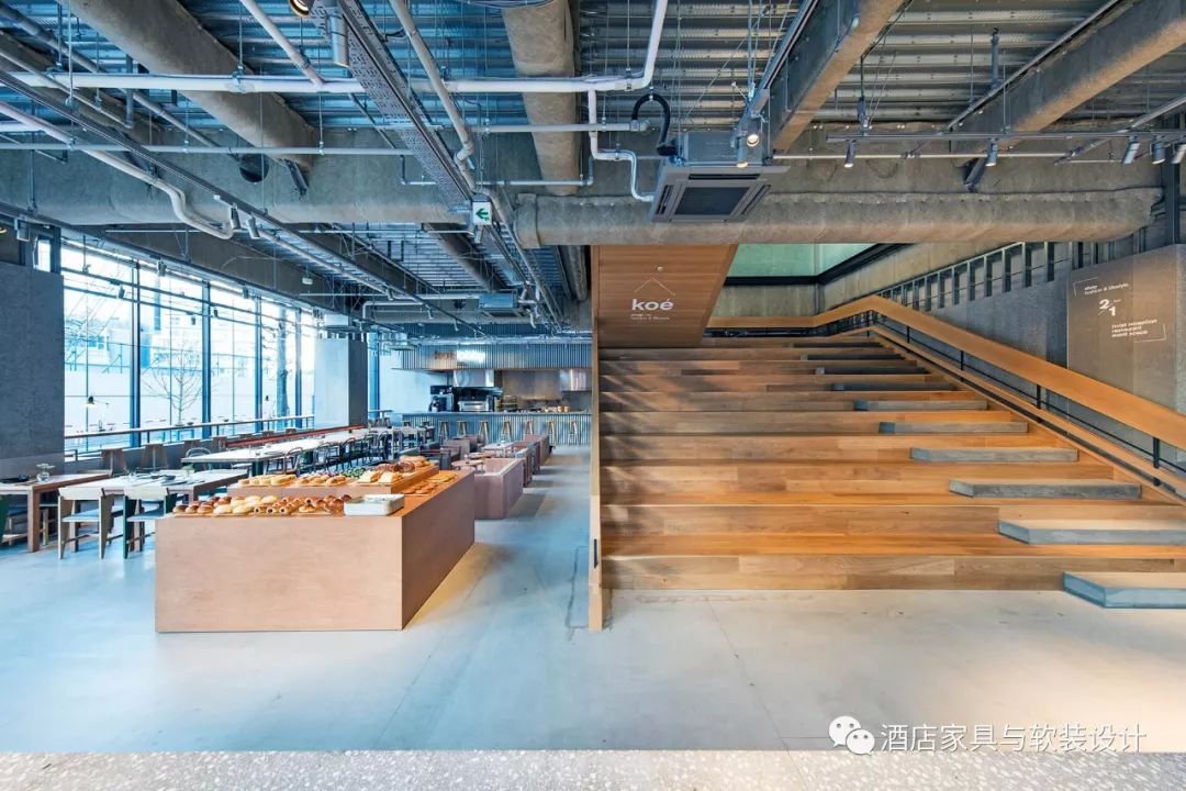 Suppose Design Office运用现代美学手法打造不同楼层的风格差异。一层设有Koé大堂(包括面包店和餐厅)和活动空间,地面铺设温暖的灰色混凝土,在家具和楼梯间广泛应用波纹金属和木块。