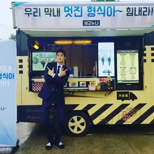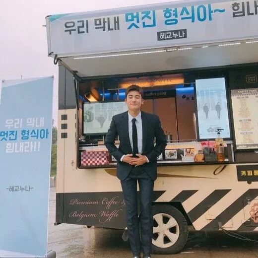 在公开的照片中,站在咖啡车和零食车前的朴炯植对着镜头摆出了各种pose,既帅气又可爱。