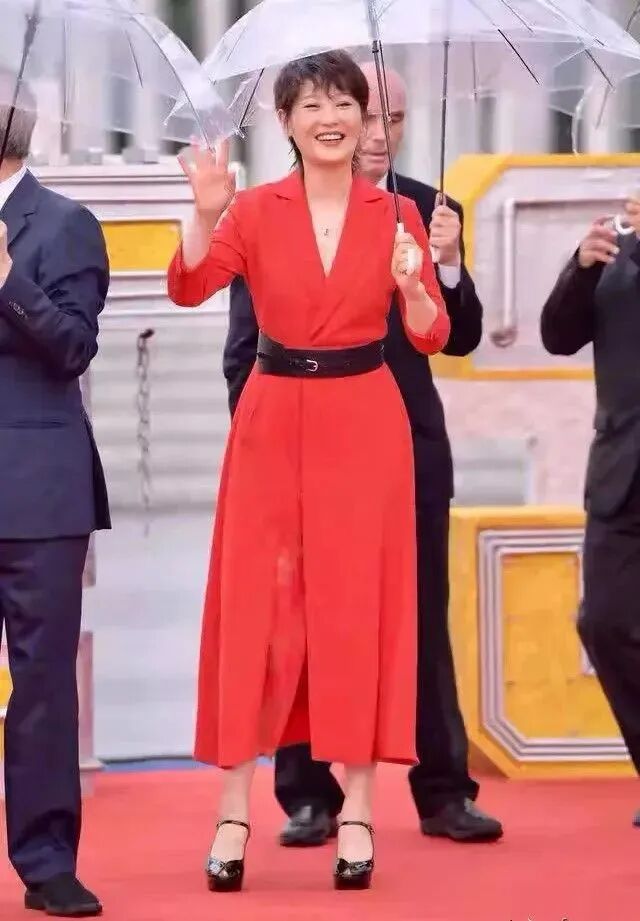 徐帆穿着一身红色的西装裙,踩了一双黑色高跟鞋,看起来是真的非常的优雅呀。而且这样看起来就算老了也还是非常的漂亮的,而且显得女人味呢。
