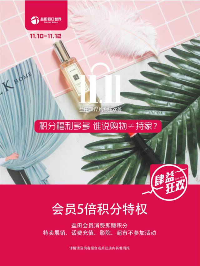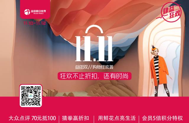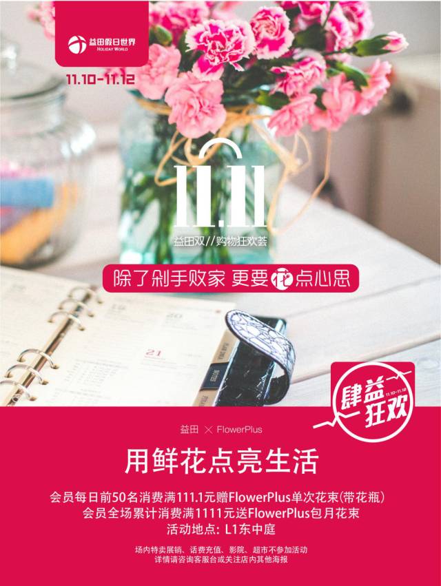 11月11日-12日,益田联手flowerplus用鲜花点亮生活,前50名会员消费满111.1元即送鲜花一束;会员全场累计消费满1111元送包月花束!