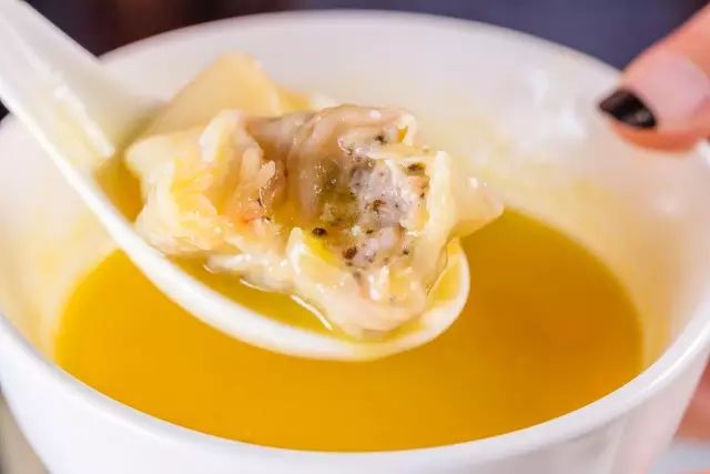 港式云吞的“丝带儿”,一口咬下,一阵黑松露的独特香气勾了魂魄~薄薄的皮子里是闪着晶莹肉汁,太诱人啦! 纯手工捶打的黑猪肉更为紧实鲜美,一大口的幸福感!”老板!再来一份!”