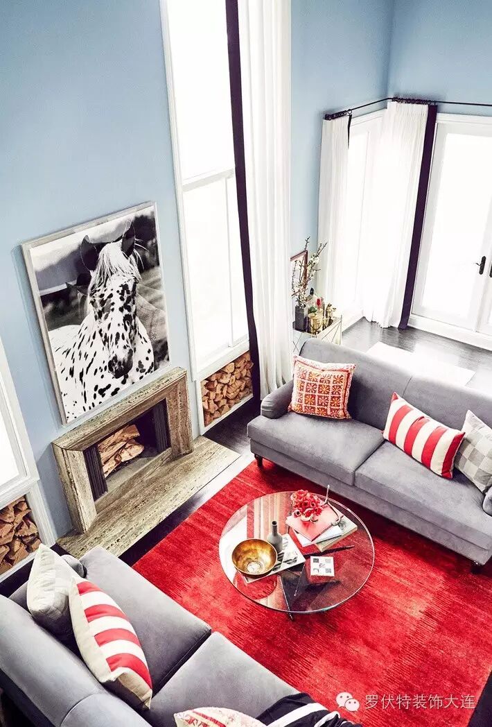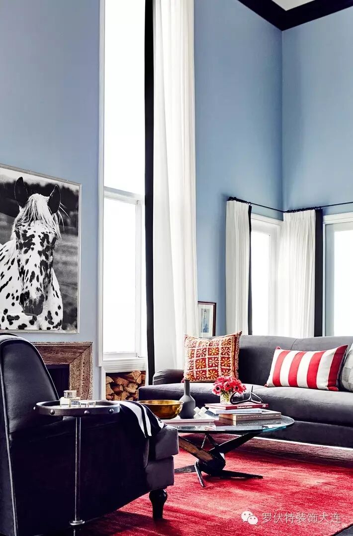 客厅的用色十分时尚且质感丰富,沉静如海的蓝色墙面与鲜艳的红色地毯搭配,极具视觉冲击力。两张对称的灰色沙发与黑白窗帘给人以低调的华丽,而墙上白马挂画也成了绝妙的点睛之笔,令人惊艳。