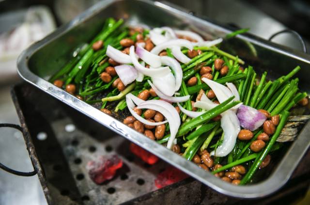 这道烤鱼是老板自创的,先用烤架烤熟之后放入铁盘加入油、花生米、香菜、洋葱等调料,再次放入小炭火炉上烤制,它的特别之处在于不带汤汁,表皮带着碳火烤过的香气,里面的肉依旧酥软滑嫩,吃起来回味无穷。以大热剧《锦绣未央》、《楚乔传》为代表的一票剧组从他家买烧烤一买就是两三千,林更新也是常客。