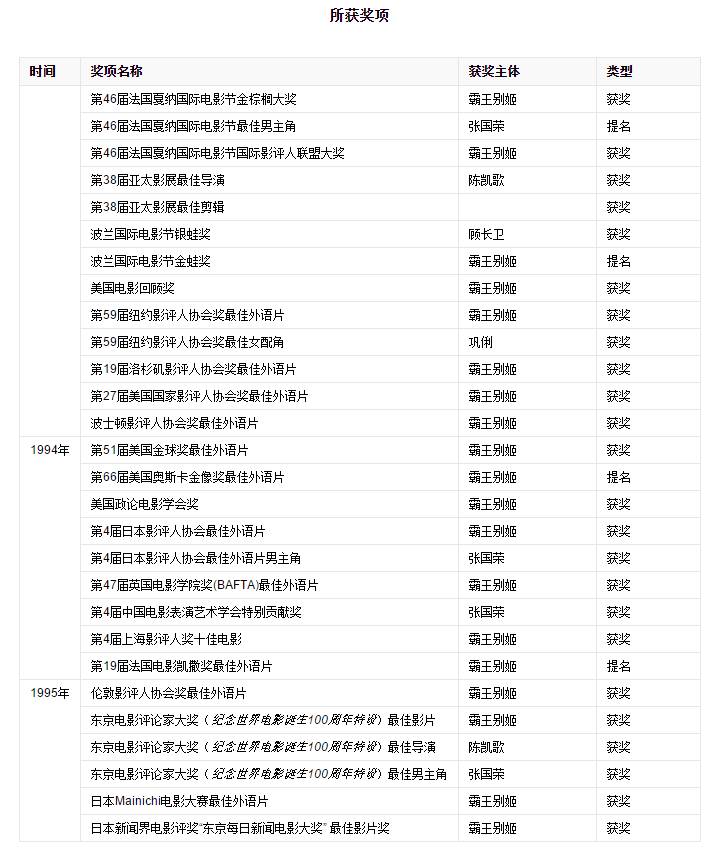 此外这部电影还获得了美国金球奖最佳外语片奖、国际影评人联盟大奖等多项国际大奖,1994年张国荣凭借此片获得第4届中国电影表演艺术学会特别贡献奖。2005年《霸王别姬》入选美国《时代周刊》评出的“全球史上百部最佳电影”。