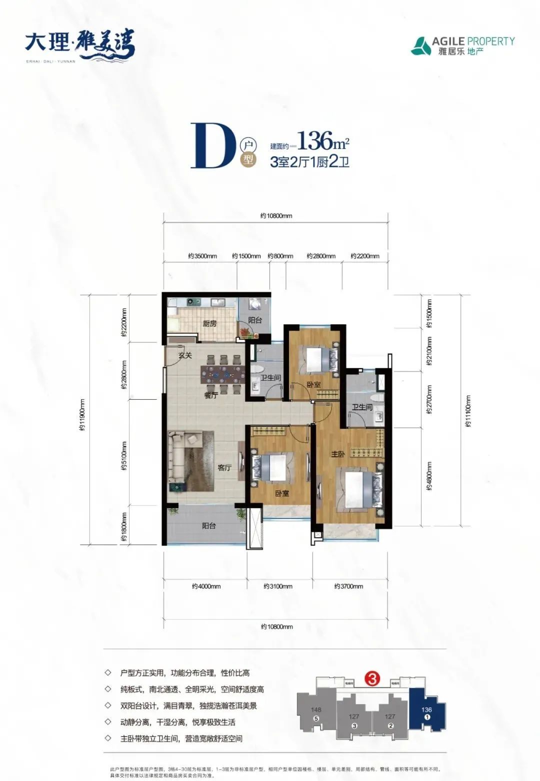 以这个建筑面积约136㎡的热销户型为例,该户型为端头房,三面采光,全明通透,双阳台设计可观景;客厅部分进深约5.1米并连接阳台,有充足空间能进行不同风格的家具摆放,采光也得到保证;在室内房间布局上,这个户型做到了动静分区、干湿分离(项目其他户型也是如此),体现出人性化设计理念,让住户住得更加舒心。