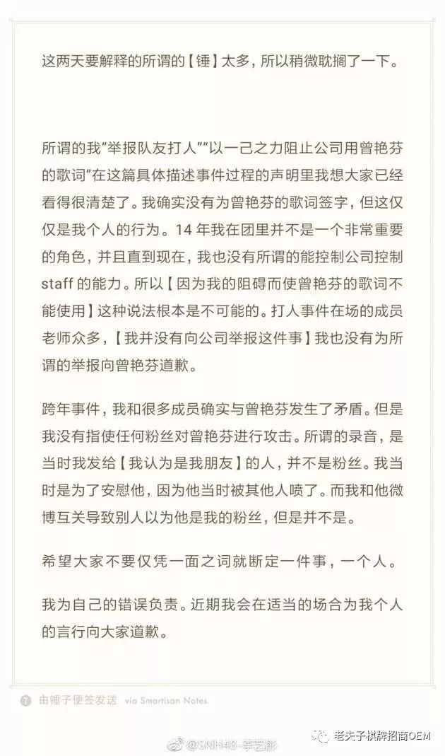 《说明》还包括与曾艳芬相关的情况,确认曾艳芬在2014年公演后台有“用胳膊卡脖子”行为,但她当时否认打人,而李艺彤则转发《说明》表示并未向公司举报有成员打人。