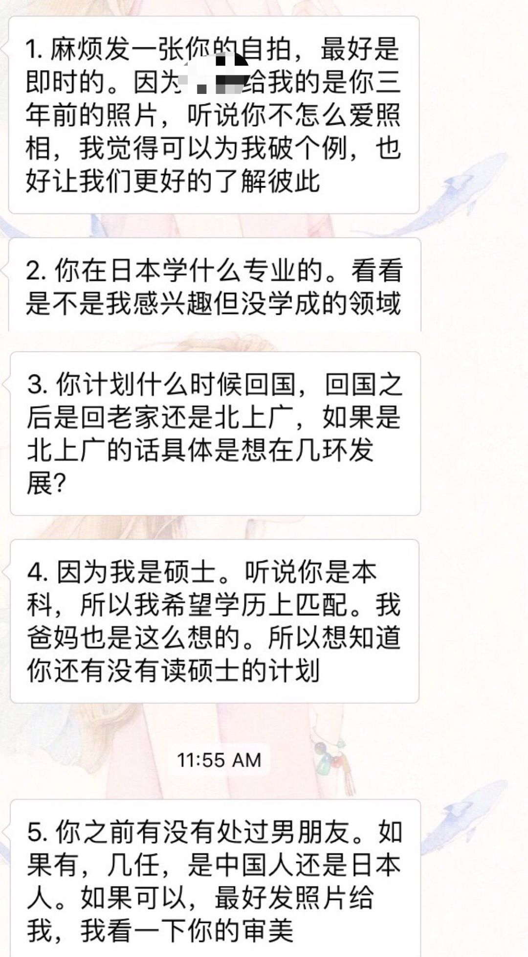 “你好,我是xxx,今年29岁,海归博士,年薪xx万,目前有车无房,婚后共同贷款买房,喜欢眼睛大皮肤白身高165以上的女生....."